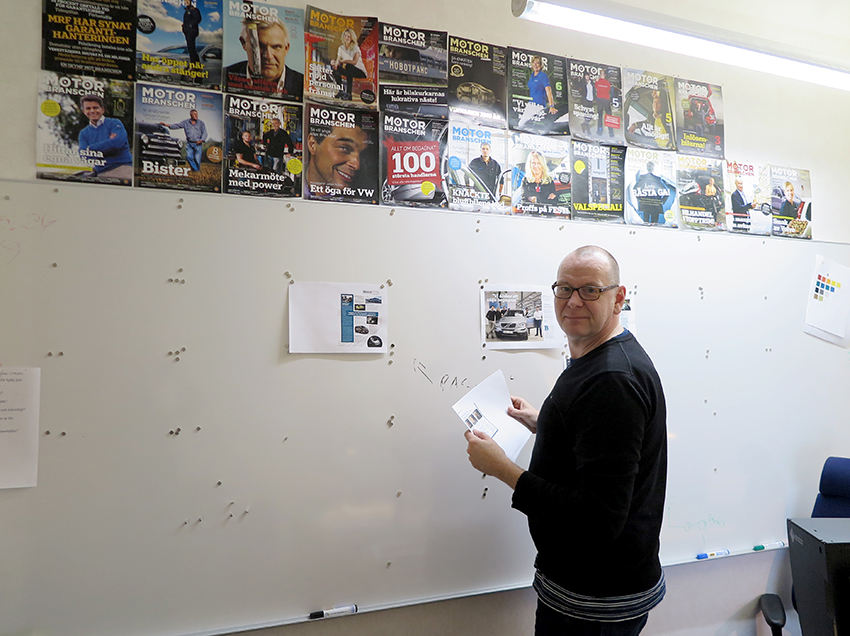 En ”vägg” där sidorna för kommande nummer sätts upp i planeringsordning är kanske lite ålderdomligt. Många har gått ifrån det, men vi gör det fortfarande. Jag är van vid den överblicken, ser direkt när motiv, färger, rubriker etcetera krockar, när tidningen rytm och färg behöver varieras. Mer om det en annan gång, finns så himla mycket säga om en tidnings rymt.