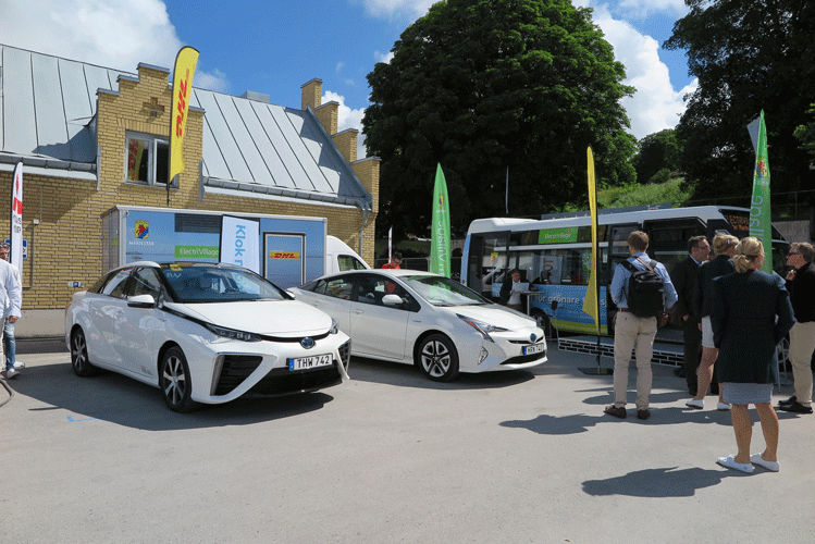 Toyota, håller till lite på en armslängds avstånd och har Sverigepremiär för nya Mirai som står sida vid sida med en liten svenskbyggd buss med batteridrift och lättviktskonstruktion. Tillverkaren heter Coman och håller till i Volvos gamla fabrik i Dalsland. Bussen rullar i Mariestad.