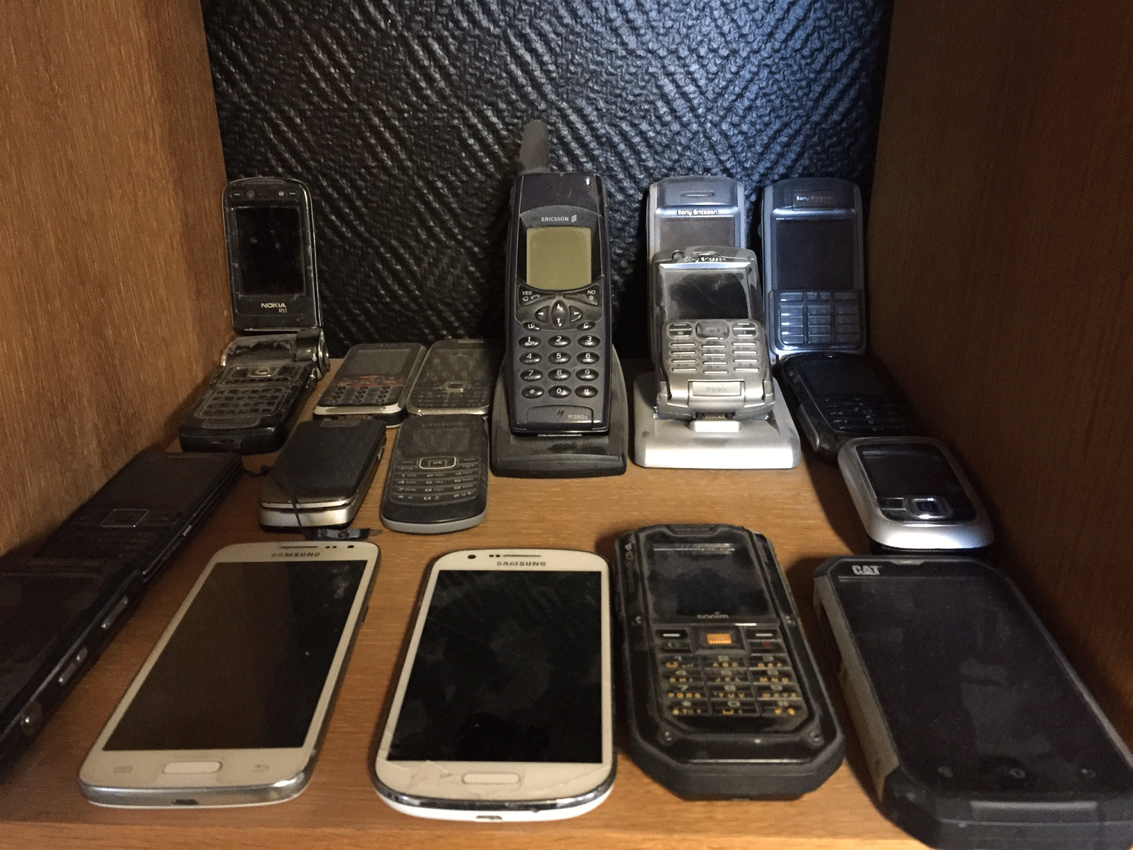 På en lackerings- och skadeverkstad i Skaraborg passerade jag den här lilla samlingen i en bokhylla på kontoret i går. Innehavaren har skapat ett minimuseum av sina gamla mobiler, Ericsson som flest – men ingen Iphone, “dem får ju barnen överta numera”, säger ägaren.