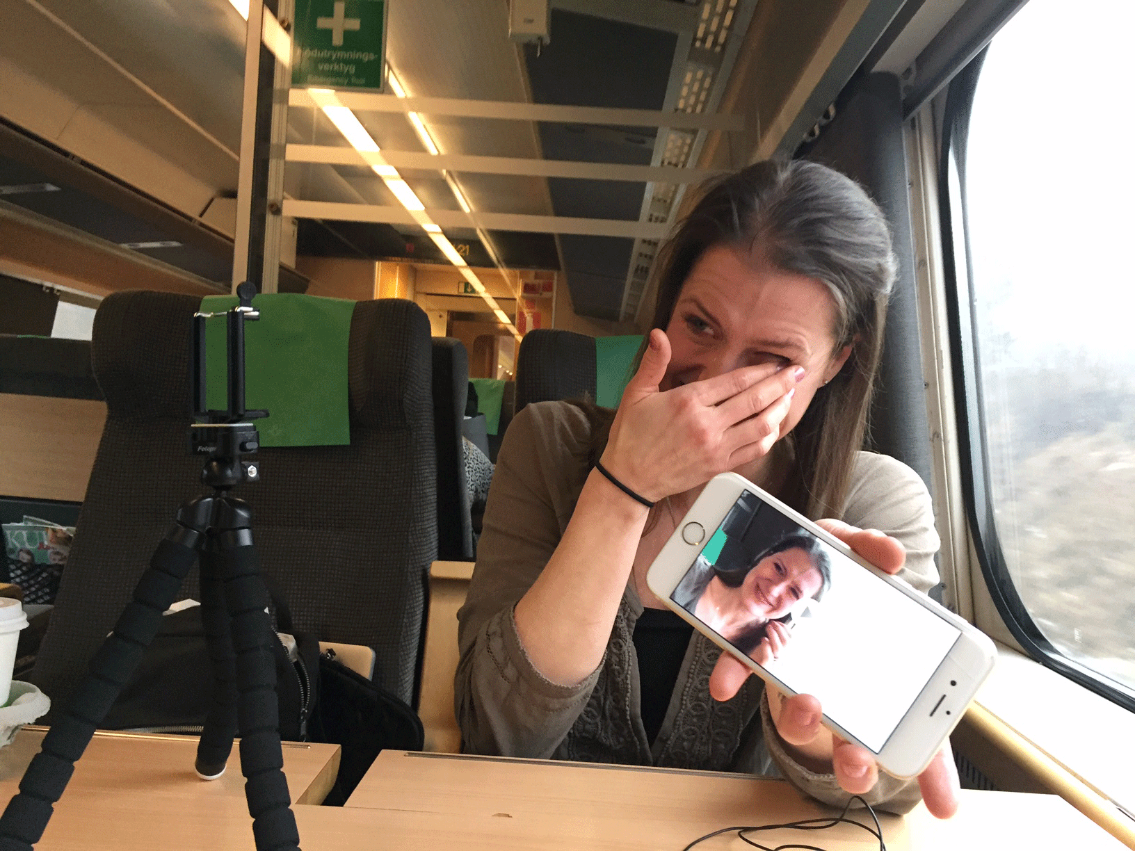 På väg till Automässan övade vi rörliga livesändningar. Anna skrattade så mascaran rann.