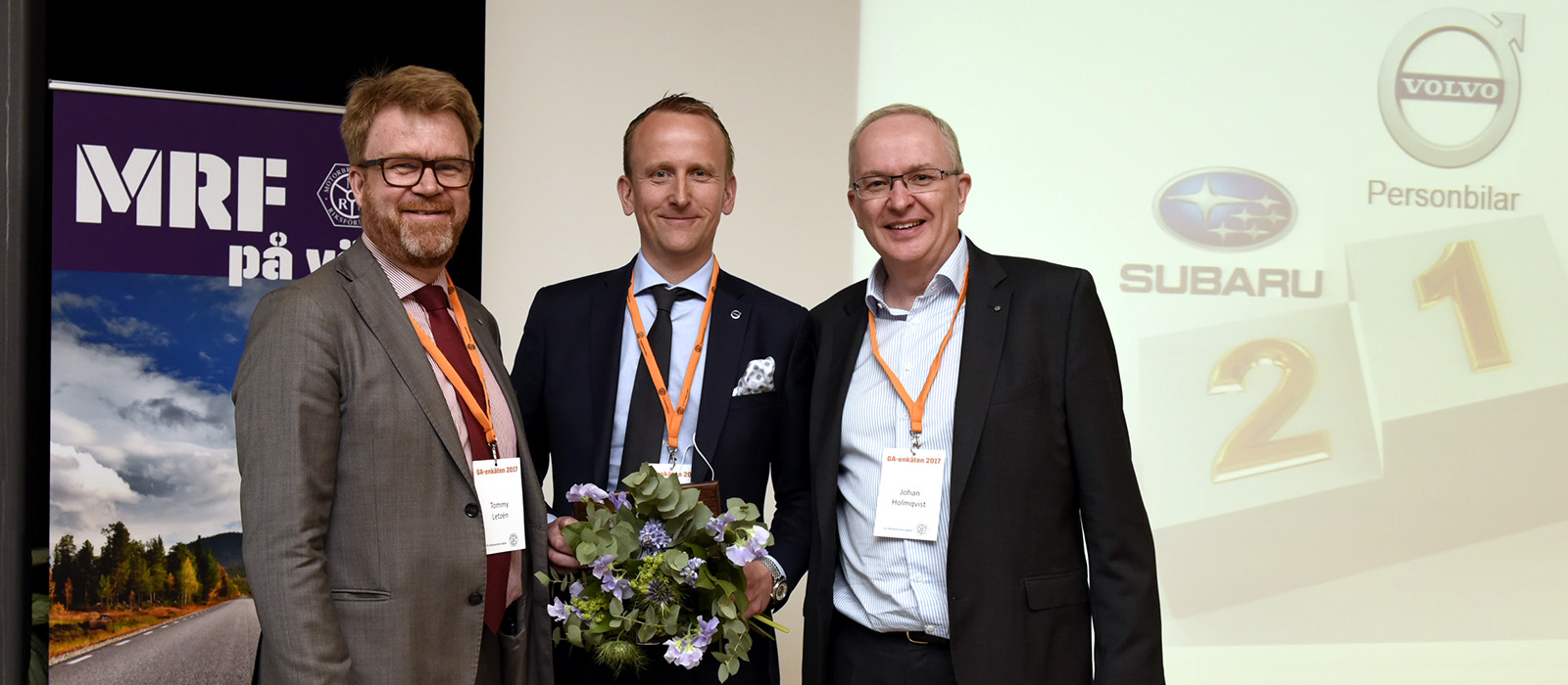 Kristian Elvefors, Volvo Car Sverige, tar emot förstapriset av MRFs vd Tommy Letzén (till vänster) och bildhandelsansvarig Johan Holmqvist (till höger).