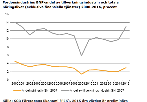 Den svenska fordonsindustrin sysselsätter totalt nästan 120 000 personer. Branschen bidrog 2015 med cirka 13 procent av tillverkningsindustrins totala del av BNP. Fordonsindustrin har även stor påverkan på näringslivet i stort. Ökar jobben inom fordonsindustrin får det positiva effekter på sysselsättningen i det övriga näringslivet.