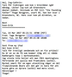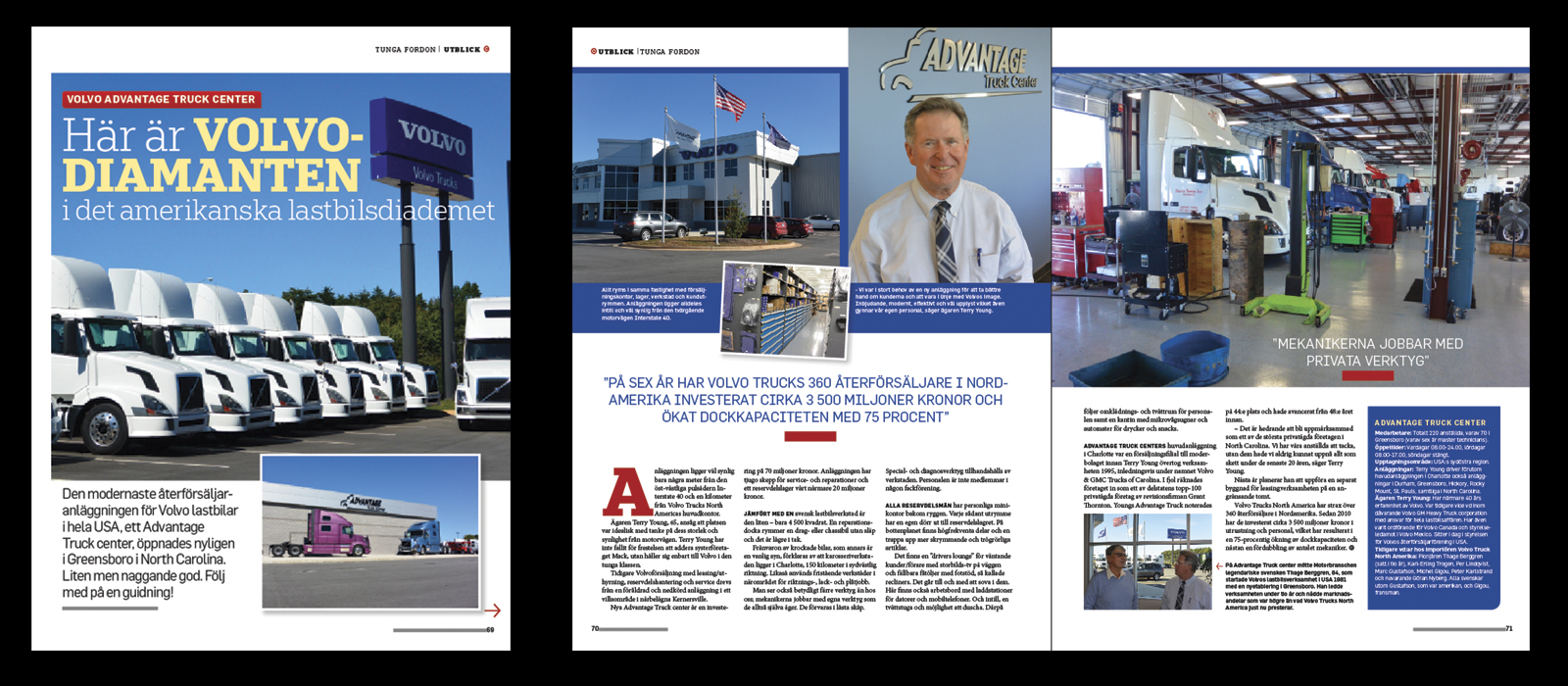 Vid intervjubesöket på USA:s modernaste återförsäljaranläggning för Volvo lastbilar, Advantage Truck center, träffade Motorbranschens utsände Sven-Erik Lindstrand från svenske nestorn Thage Berggren, 84, som startade Volvos lastbilsverksamhet i USA 1981 och nådde rekordstor marknadsandel.