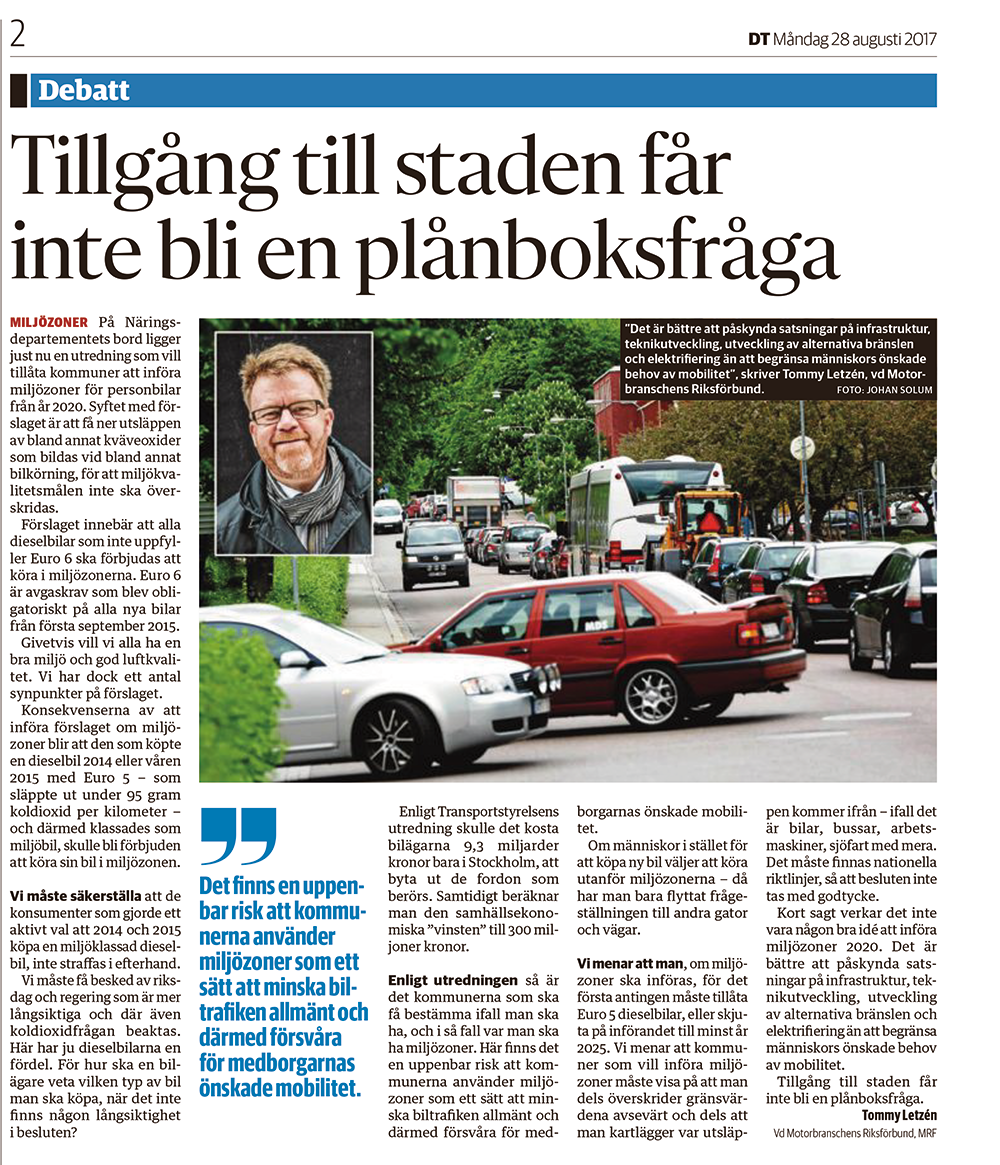 Vi måste få besked av riksdag och regering som är mer långsiktiga och där även CO2-frågan beaktas, här har ju dieselbilarna en fördel. Hur ska en bilägare veta vilken typ av bil man ska köpa när det inte finns någon långsiktighet i besluten? Enligt transportstyrelsens utredning skulle det kosta bilägarna 9,3 miljarder kronor bara i Stockholm, att byta ut de fordon som berörs. Samtidigt beräknar man den samhällsekonomiska ”vinsten” till 300 miljoner kronor.