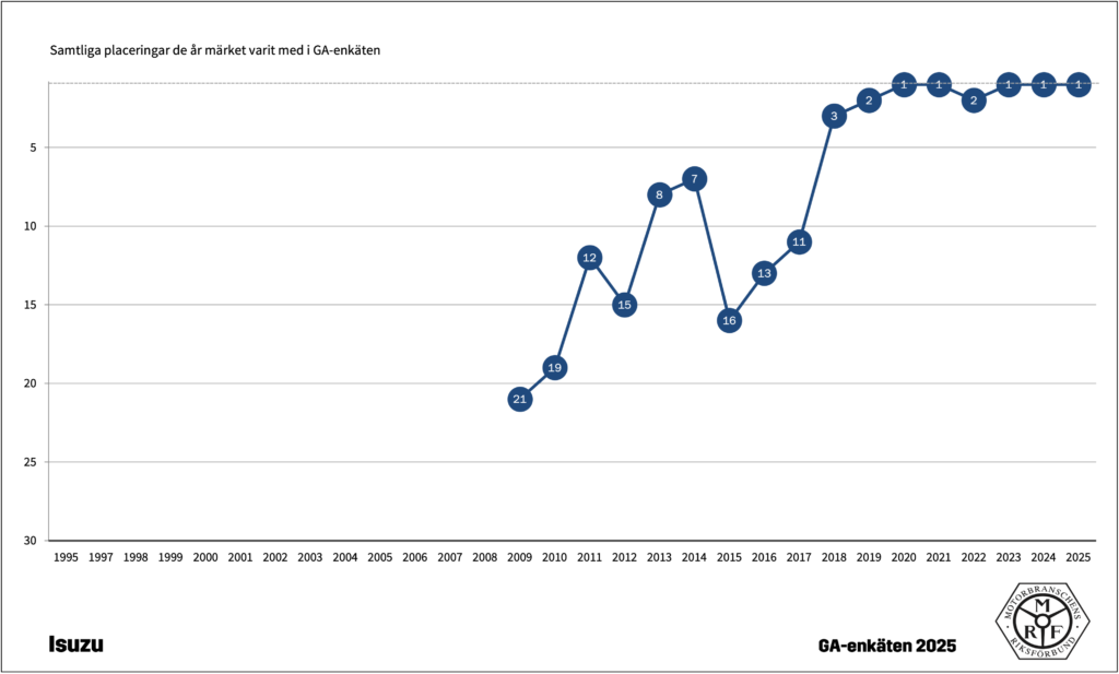 Isuzu ligger som vanligt i topp på de flesta frågor, 63 av 80 för att vara exakt. Och på 78 av 80 hamnar de på pallplats.