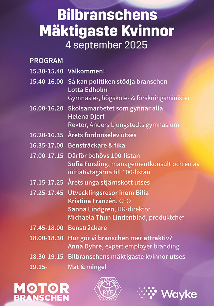 Den 4 september samlade vi branschen på Bilia Haga Norra i Stockholm för att kora bilbranschens mäktigaste kvinnor 2025. Eventet genomfördes i samarbete med Bilia, som i år stod som värd. Under kvällen avslöjades vinnarna i årets sju kategorier: Stort grattis alla fantastiska deltagare och vinnare!